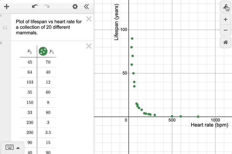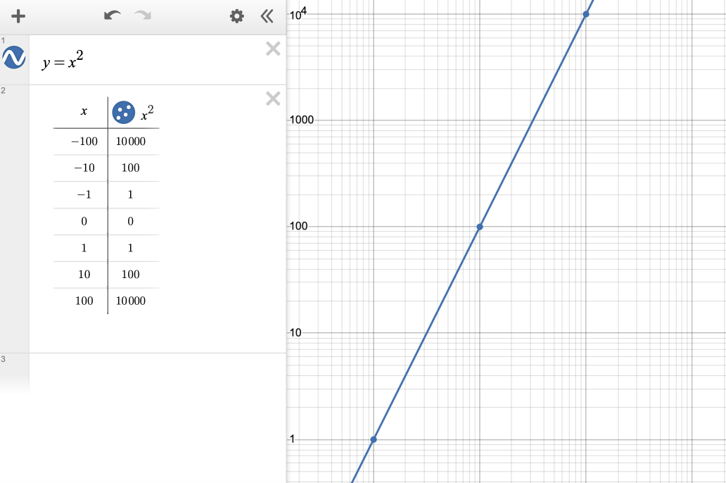 Since every line represents a common multiple instead of a common factor, the distance from 10 to 20 is the same as the distance from 20 to 40, or 40 to 80, or 1000 to 2000. You’ll notice that lines that are evenly spaced (10, 20, 30) on a linear plot are unevenly spaced on a logarithmic plot, getting narrower as you increase, until you reach 100, at which point it resets. You’ll also notice that the logarithmic values can get very small by zooming or panning, but they never reach 0 in the x- or the y-direction. Besides making it easier to display data that spans many orders of magnitude, logarithmic scales can also help to visualize the behavior of certain kinds of curves. Because there is a sense in which logarithms transform multiplication and division into addition and subtraction, logarithmic scales can plot multiplicative change in a way that appears linear. For example, exponential functions appear linear when the y-axis is logarithmic, and power functions appear linear when both axes are logarithmic. This might help you compare or reason about key features of different functions.