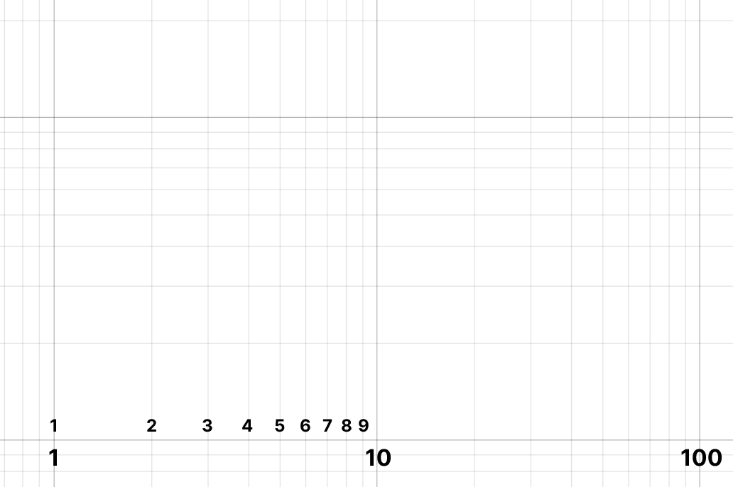 When an axis is set to a logarithmic scale, you’ll notice some interesting patterns. First, you’ll find that cycles repeat every power of 10. So the lines between 1 and 10 are exactly the same distance as between 10 and 100, or 100 and 1000. Second, within those, lines get closer together as your numbers increase: