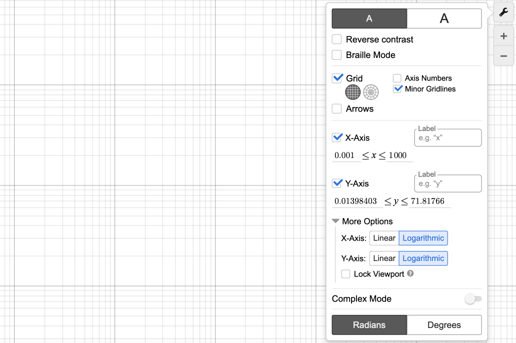 To set either axis to a logarithmic scale, click on the wrench icon in the top left corner of the graph to open the graph settings menu or type CTRL + ALT + G. From there, open the ‘More Options’ section and change one or both axes from linear to logarithmic.
