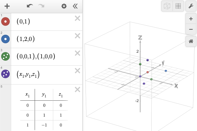One of the first things you can create in the calculator is points. When working in 2D, points are plotted as coordinate pairs of \((x,y)\). You can still plot an \((x,y)\) point in the 3D Calculator, and it will appear on the \(XY\) plane. By adding a \(z\) component, with coordinates of the form \((x,y,z)\), you have the ability to plot your point anywhere in 3D space. You can plot your points individually on an expression line, on the same line separated by commas, or with variables defined by tables, sliders, or lists.