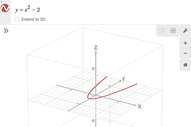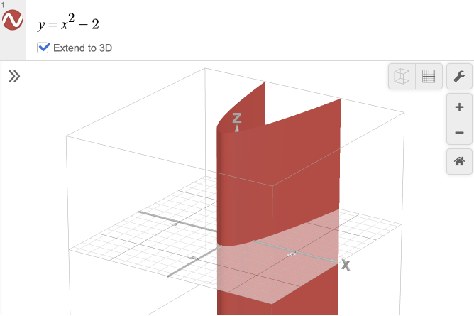Equations when working in 2D are defined with the variables \(x\) and \(y\), whereas 3D enables you to work with expressions in \(x\), \(y\), and \(z\). If you type an expression in the 3D Calculator with only \(x\) and \(y\) variables, you will see your curve graphed flat on the \(XY\) plane, and a new option, labeled 'Extend to 3D,' appears below your expression, unchecked. By checking this box, you can see the entire surface of points that satisfies your expression for all \(z\) values. Whenever your expression includes a \(z\) variable, you won’t see this checkbox option.