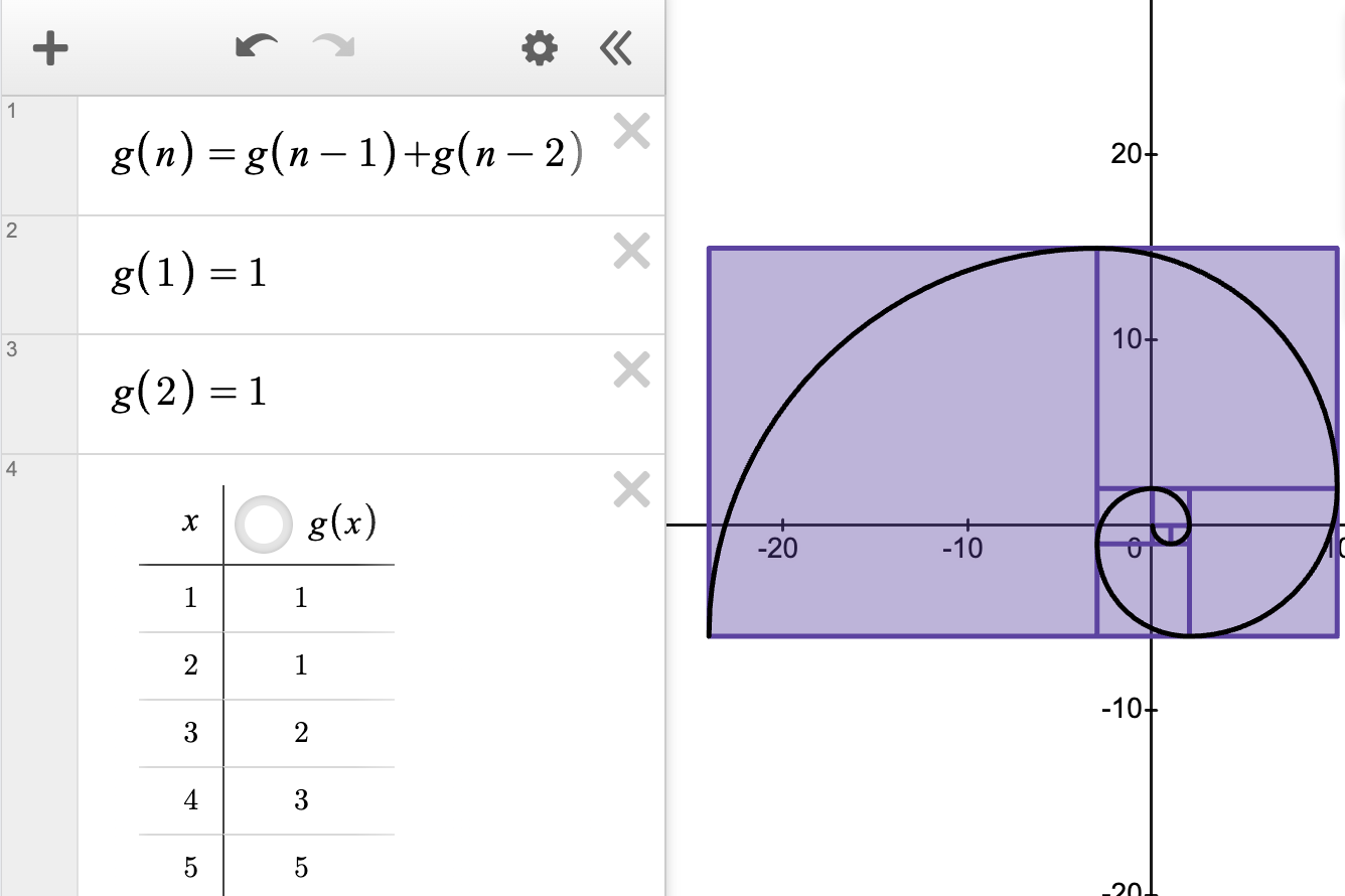 From the Fibonacci sequence, you can create the Fibonacci spiral by constructing squares with side lengths following the Fibonacci sequence and drawing arcs through the opposite corners of these squares. Open this Fibonacci spiral example graph to explore the connection between the sequence and the spiral.