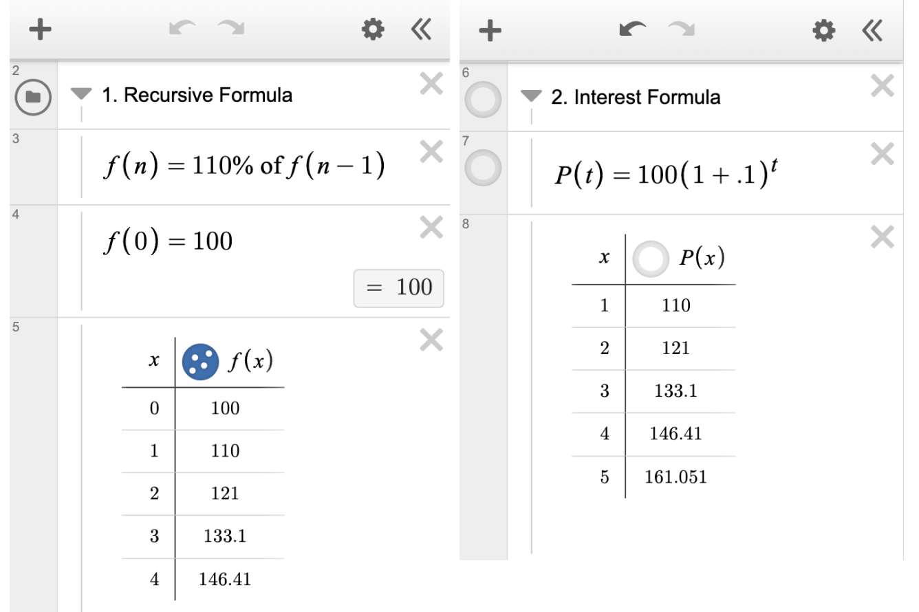 To model adding an extra \($100\) a year in the recursive formula, simply add \(100\) to the original rule \((f(n) = 110\%\) of \(f(n-1) + 100)\). Open this compound interest example graph to see the recursive formula, interest formula, and additional contribution examples.