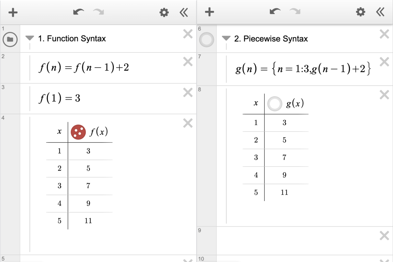 We know the first term is \(3\), and each new term can be found by adding \(2\) to the previous term. In piecewise notation, we write this as \(f(n) = \{n=1:3, f(n-1) + 2\}\). This syntax says “when \(n = 1\), then \(f(n) = 3\). Otherwise, \(f(n)\) is defined as \(f(n-1) + 2\).” Open the example graph to compare function and piecewise notations.