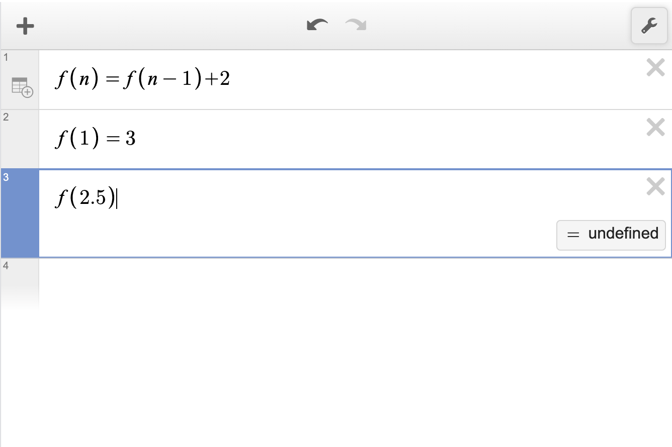 If we make a recursive call outside of the domain, such as \(f(2.5)\), Desmos will return “undefined.” This is because the recursive rule will look back one to \(f(1.5)\) and then \(f(.5)\). Thus, it can’t reach our base case.