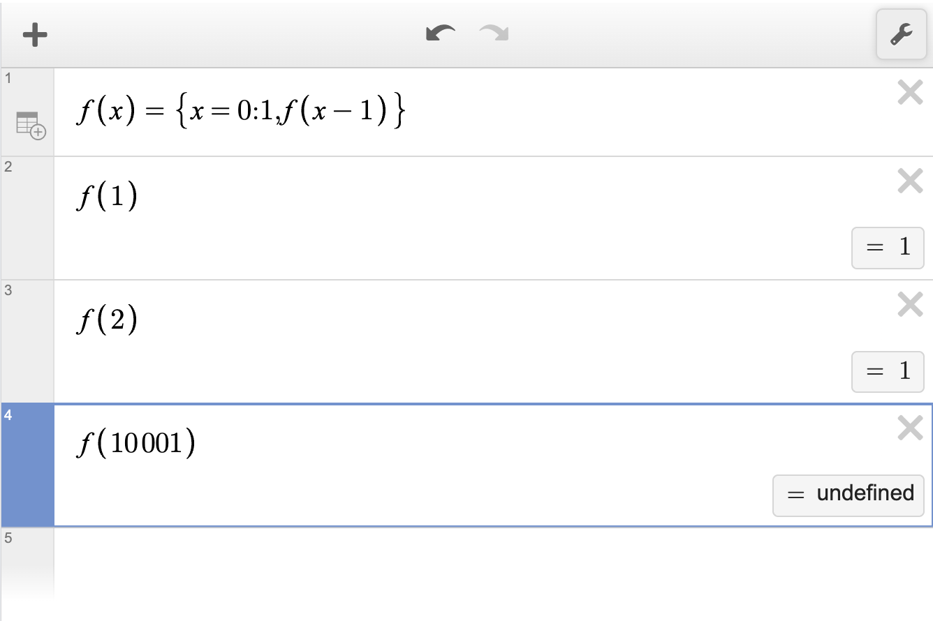 Consider the recursive function \(f(x) = \{x=0: 1, f(x-1)\}\). Starting with \(f(0) = 1\), this defines every term to be equal to the previous term. That is, \(f(2)\) will equal \(f(1)\), which will equal \(f(0)\), which is our defined base case. However, while this function should always return 1 for positive integer values, it will return \(f(10001) =\) undefined. Evaluating \(f(10001)\) would require more than 10,000 steps to reach a base case (in this case, looking one term backwards each time), so, although it exists, the calculator returns “undefined.”