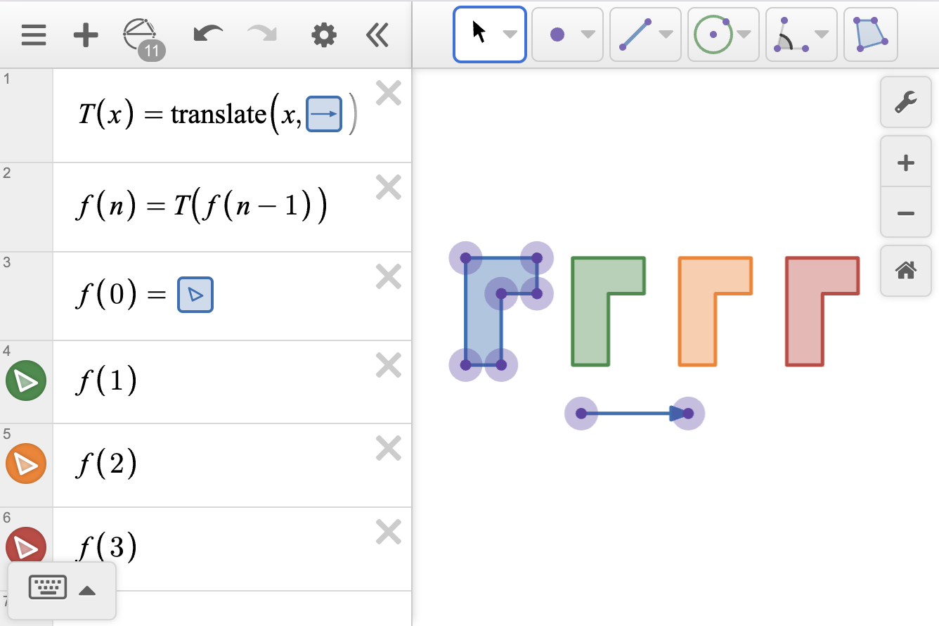 As an example, define a translation function \(T(x) =\) translate\((x,\) vector). This function translates any object \(x\) in the direction and magnitude of the vector. This can now be used in a recursive function, \(f(n) = T(f(n-1))\), which will create a sequence where each new term is the translation of the previous term. To define a base case \(f(0)\), begin by typing f(0)=, and insert the token of your initial object by using shift + click on the object. Now that the sequence of translations has been defined, f(1) shows the translation applied once, \(f(2)\) shows the translation applied twice, and so on.