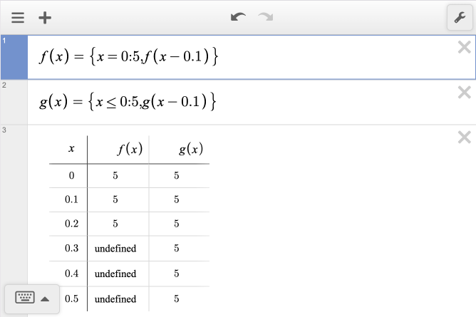For example, consider the recursive function \(f(x) = {x=0:5, f(x-0.1)}\), which defines a base case as \(f(0)=5\) and each term \(f(x)\) is equal to the term \(f(x-0.1)\). From that definition, we might expect \(f(0)=f(0.1)=f(0.2)=f(0.3)=...=5\). However, you may observe that some values of x return ‘undefined.’ This is because our system defines decimals internally using a floating point approximation. As \(0.1\) is repeatedly subtracted from the term number, the sequence of decimals that internally defines it doesn’t always reach precisely \(0\). Because of this, we recommend using integers for the arguments of recursive function, as arithmetic on integers is more often exact.