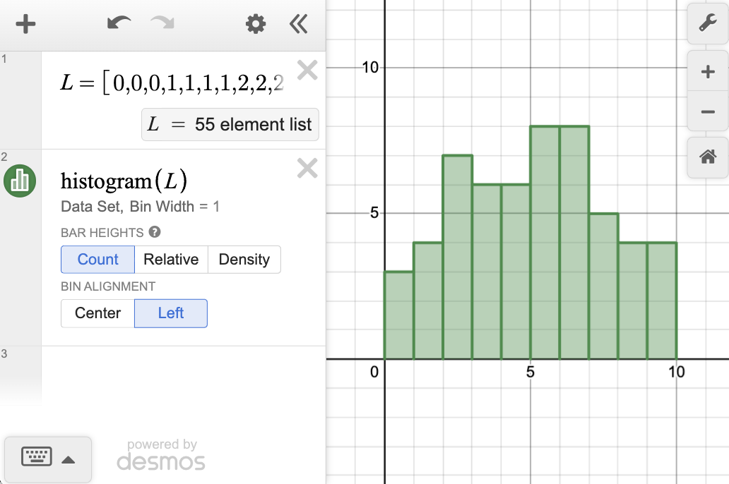 Create a histogram from data contained in a list using bin width to group the data. By default, bar heights are set to "Count," so that a bar's height is equal to the raw number of data points in its bin. If the "Relative" option is selected, the bar heights are adjusted proportionally so that their sum is 1. If the "Density" option is selected, the bar heights are adjusted proportionally so that the histogram's total area is 1.