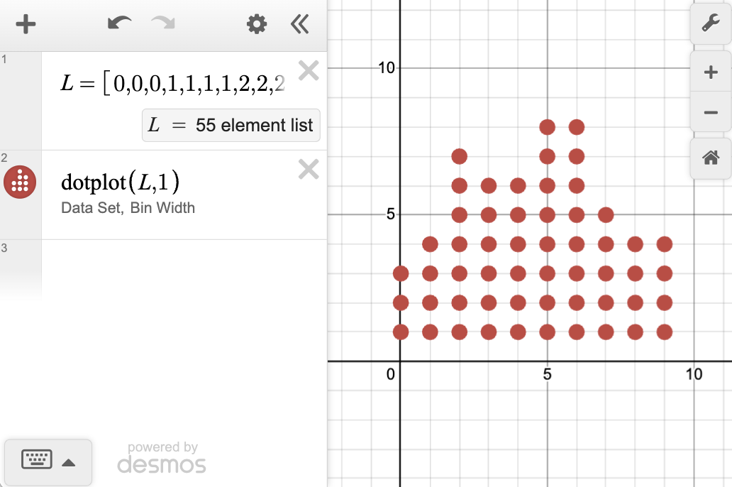 The calculator provides the boxplot, dotplot, and histogram functions for plotting some common visualizations based on univariate data. These functions are available from the "Dist" section of the "functions" menu on the keypad, and can also be typed directly into an expression using a keyboard.