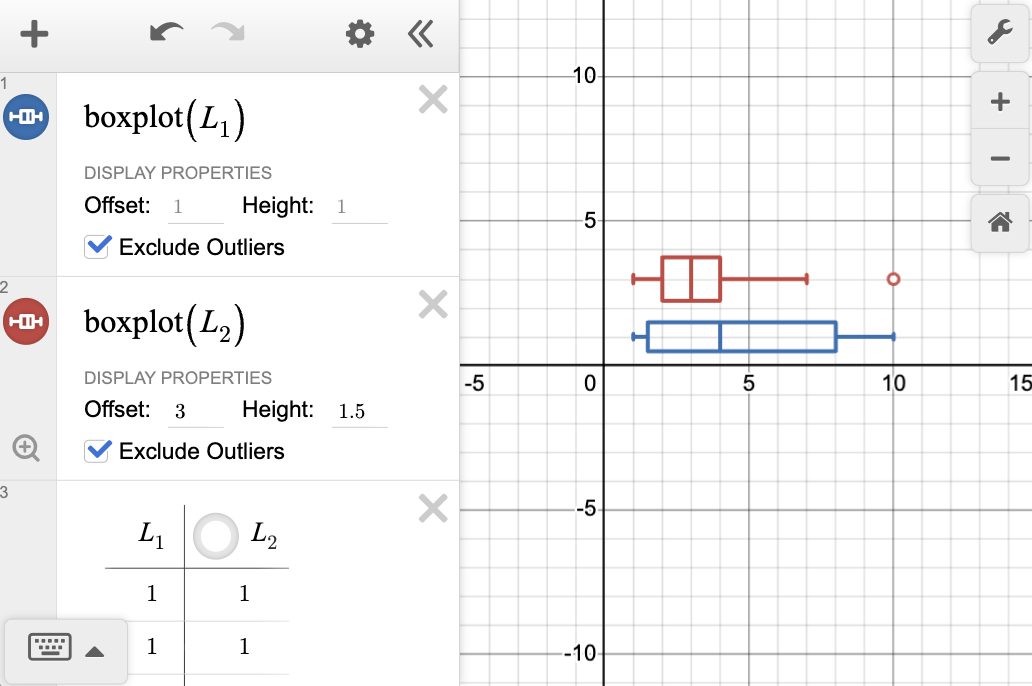 Create a box-and-whisker plot from data contained in a list using the command \(boxplot\). By default, the plot has a vertical offset of one unit, and the box is one unit high. The offset and box height may be changed via the input fields. You also have the option to exclude outliers from your data set.
