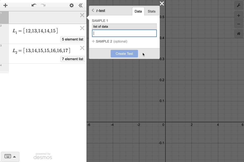 To perform a two-sample t-test, you can enter two lists of data manually in the Data tab or summary statistics in the Stats tab. Or, you can use two lists of data you’ve already created in the expression list.