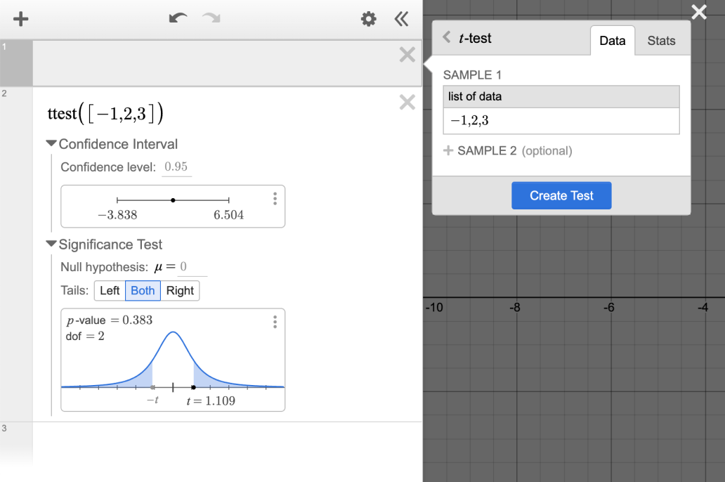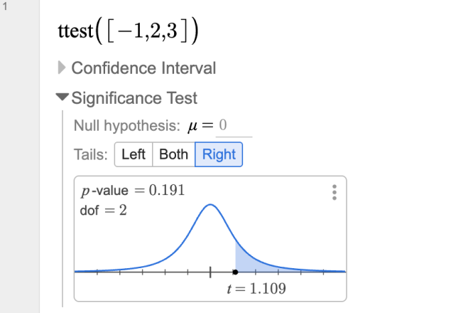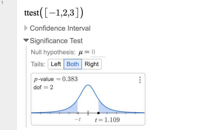 For example, if you enter the values \(1,2,3\) and a population standard deviation of \(0.5\), clicking Create Test will add ztest([1,2,3],.5) to the expression list, along with Confidence Interval and Significance Test sections.