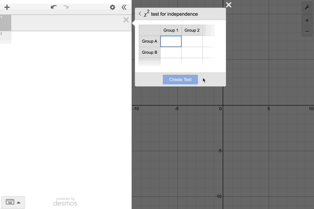 To perform a chi-square test of independence, enter your data in a two-way table. Enter one variable across the columns (Group 1, Group 2, etc. ) and the other down the rows (Group A, Group B, etc.). Add more data by clicking into the next cell of the table.