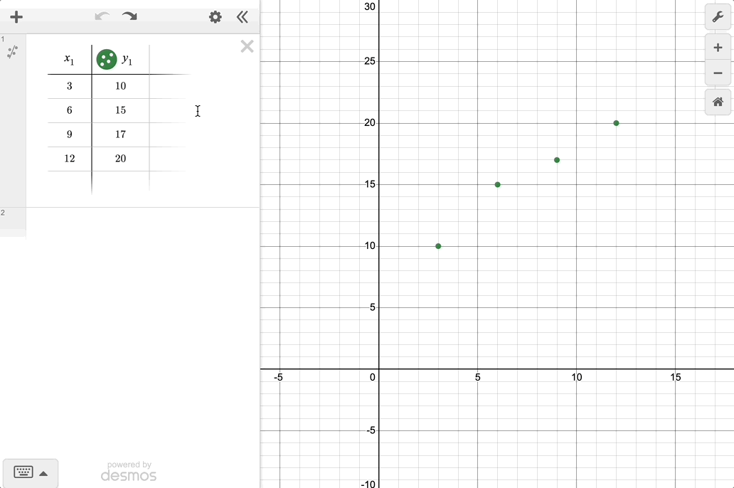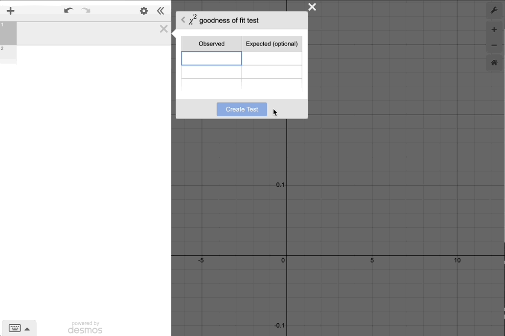 For example, if you enter \(15, 5, 10, 10\) in the first column and \(15, 15, 15, 15\) in the second column, clicking Create Test will add chisqtest\(([15,5,10,10],[15,15,15,15])\) to the expression, along with Observed (Expected) and Significance Test sections.