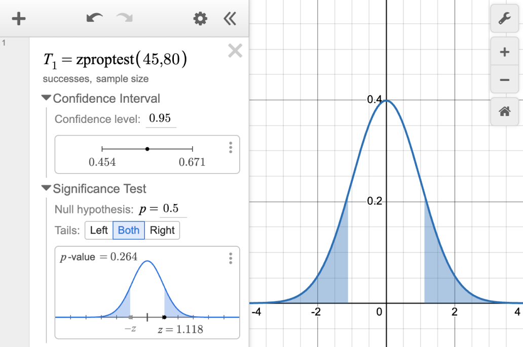 For example, if you enter \(45\) for the number of successes and \(80\) for the sample size, clicking Create Test will add zproptest\((45, 80)\) to the expression list, along with Confidence Interval and Significance Test sections.
