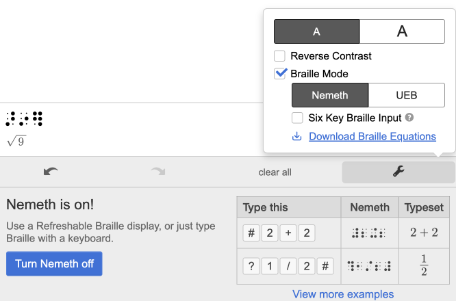 We have support for braille in both UEB and Nemeth, as well as a reverse contrast mode to help visual accessibility. Click the wrench icon to access these features.