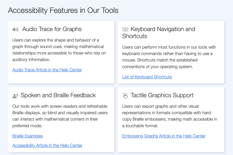 We work to build math tools that everyone can operate with confidence. To do that, we need supporting resources that are equally accessible. Weâve streamlined our Accessibility page to help all of our users find the information they need. The updated page includes our latest conformance reports and highlights features like audio trace for graphs, high contrast and large print options, and keyboard navigation and shortcuts.