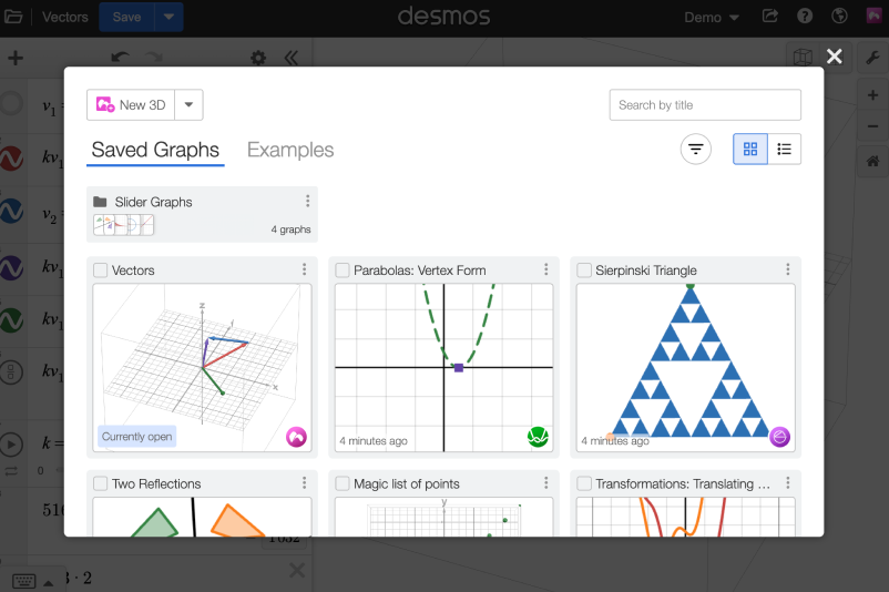 Your saved graphs are now easier to wrangle, wherever you create them. In the Graphing, Geometry, and 3D Calculators, click the folder icon (or press CTRL + O / CMD + O) to open the new interface and access all your saved and example graphs in one place. Under the New Graph dropdown, find the option to create a New Folder and start organizing your work.