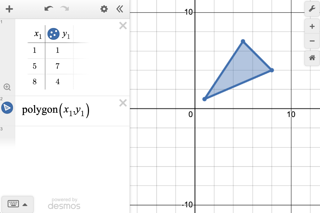 The polygon function can be used to connect points using a table or list of coordinates. In the example shown, a table is created containing the vertices of the polygon. On the next expression line we use the polygon function with the table headers x1, y1 as the two arguments needed to graph the polygon.