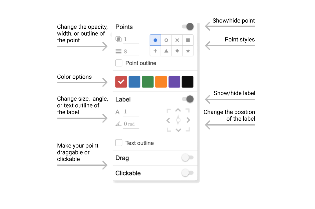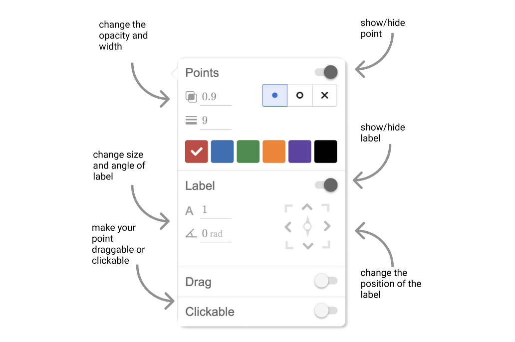 Long press the icon to the left of your expression to bring up the options menu for the plotted point. You will be able to show/hide the point, show/hide the label, make your point draggable, and adjust the opacity, width, font size, position and angle of the label.