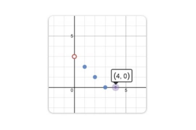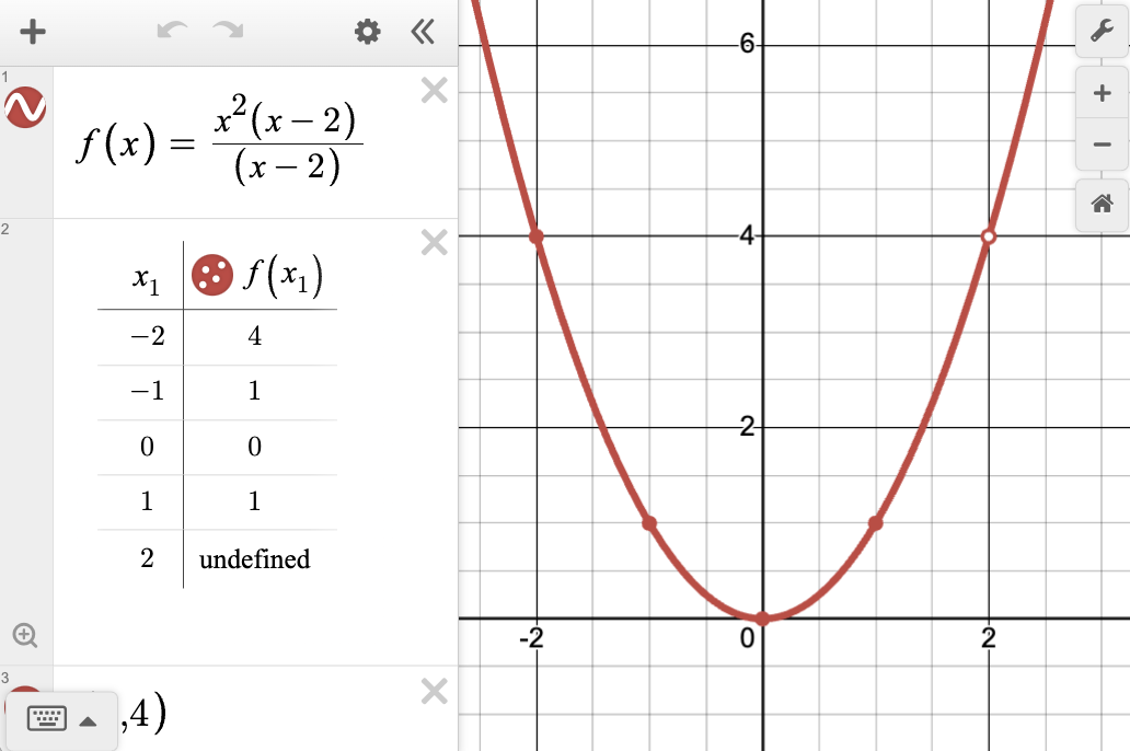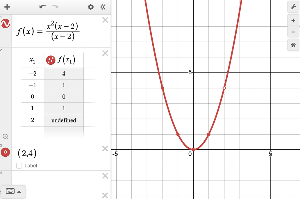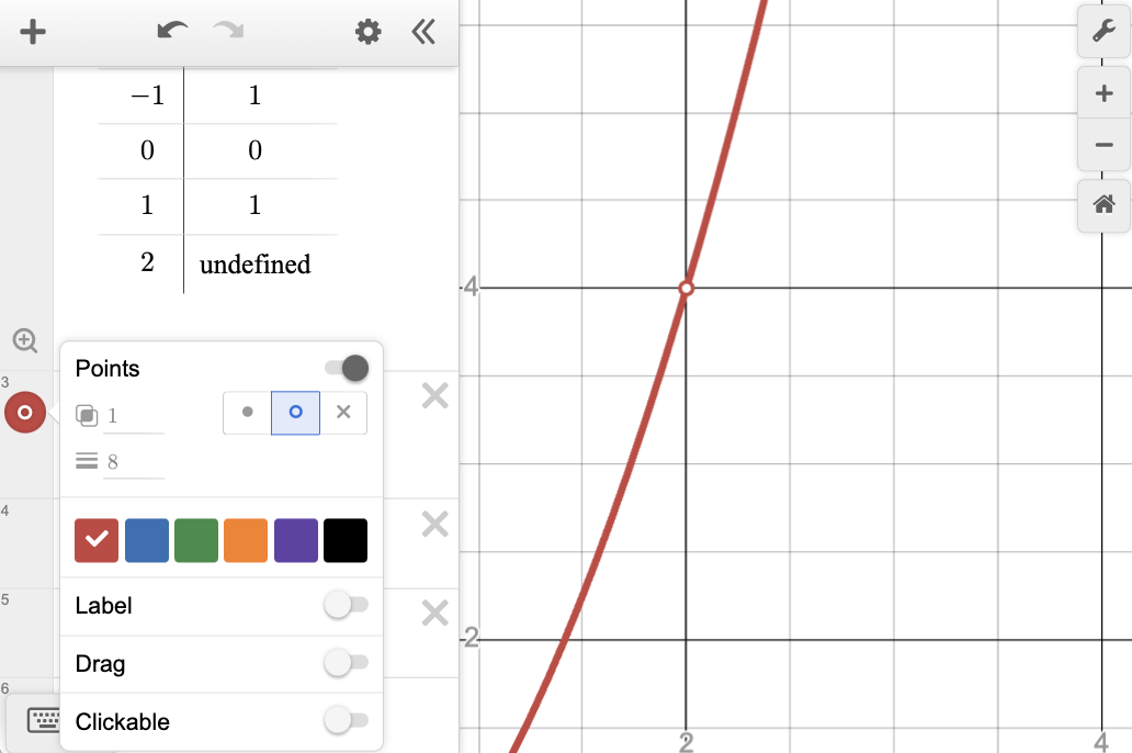 Once you have identified a point of discontinuity, you can plot it in a separate expression line and change the point from a closed circle to an open circle. To do so, long press the color icon next to the expression. The options menu will appear allowing you to select an open circle to plot the point of discontinuity. Explore each graph in this article by clicking on its image.