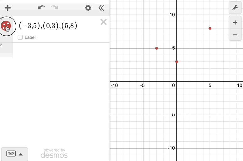 In Desmos 3D, you can plot a point by entering the coordinates (x, y, z). Click and long-hold the color icon in the expression line to open the style menu for a graphed item to change the size and color of the point. Similar to the graphing calculator, try plotting points individually, on the same expression line separated by commas, or with variables defined by tables, sliders, or lists. If you are using a table, you will need to reference the table variables in a separate expression line to see the points from the table plotted in the cube.