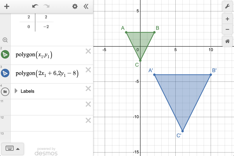 In this example, the polygon is transformed using the expression list in the Graphing Calculator. It’s dilated by a factor of 2, and translated 6 units horizontally and -8 units vertically.