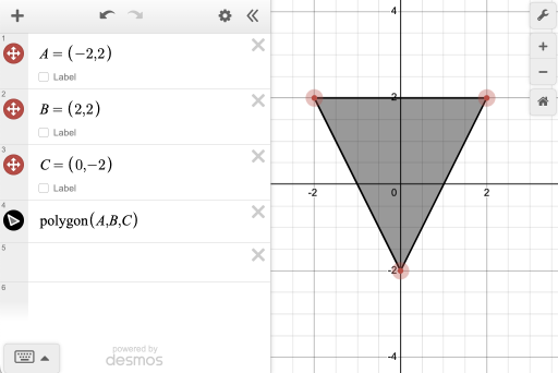 Another way to create a polygon in the Desmos Geometry Tool is to use the polygon tool from the Geometry Toolbar. Once it’s selected,click on the graph paper to choose points as the vertices of the polygon. Be sure to click back to the starting point to close your polygon.