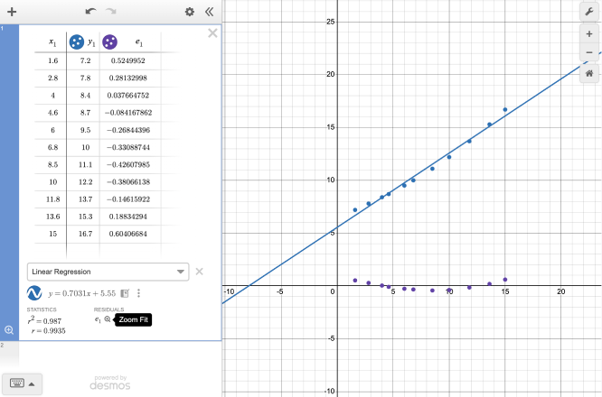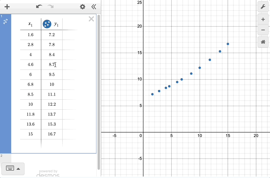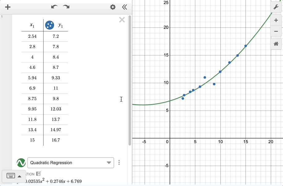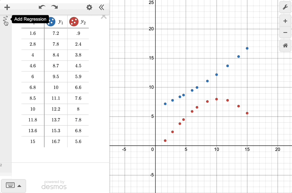 Once you have data in a table, you can create a custom regression model in a new line by using the tilde symbol (~) in place of the equals sign (\(=\)). Use your table's column names (e.g., \(x_1\) and \(y_1\)) to reference the data in your model.