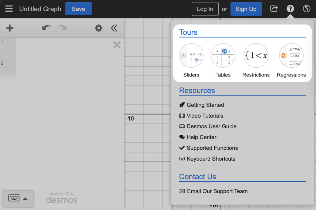 To get started with regressions, you can follow a Regressions Tour in the Help Menu in the upper right of the calculator.