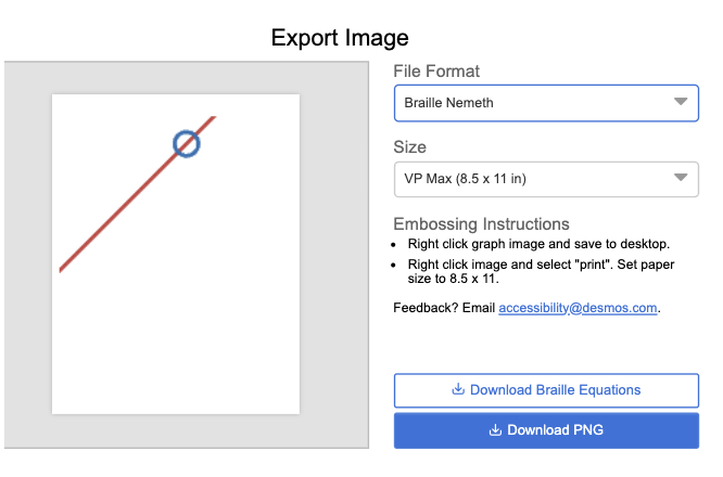 The Desmos Graphing Calculator and Desmos Geometry Tool have the ability to export graphs for a Braille embosser, enabling students to feel the graph rather than hear it. Supported embossers include the Tiger Columbia and VP Max, and the Enabling Technologies Romeo 60 and Juliet 120. Get started by watching the video and dive deeper with the resources below. For more information on embossing and our other accessibility features, visit www.desmos.com/accessibility.